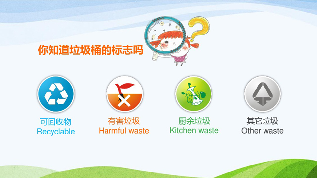 如今中古哦生活垃圾一般可分為四大類:可回收垃圾、廚余垃圾、有害垃圾和其他垃圾。目前常用的垃圾處理方法主要由:綜合利用、衛(wèi)生填埋、焚燒發(fā)電、堆肥、資源返還。廢紙是我們學(xué)習(xí)容易產(chǎn)生的垃圾,她的回收利用價(jià)值很高:回收利用1噸廢紙可以再造出0.8噸好紙,可以挽救17棵大樹(shù),節(jié)省3立方米的垃圾填埋廠空間,降低造紙75%的污染排放,而每張紙最少可以回收兩次!以下最新垃圾分類ppt模板由分類垃圾桶網(wǎng)收集整理。