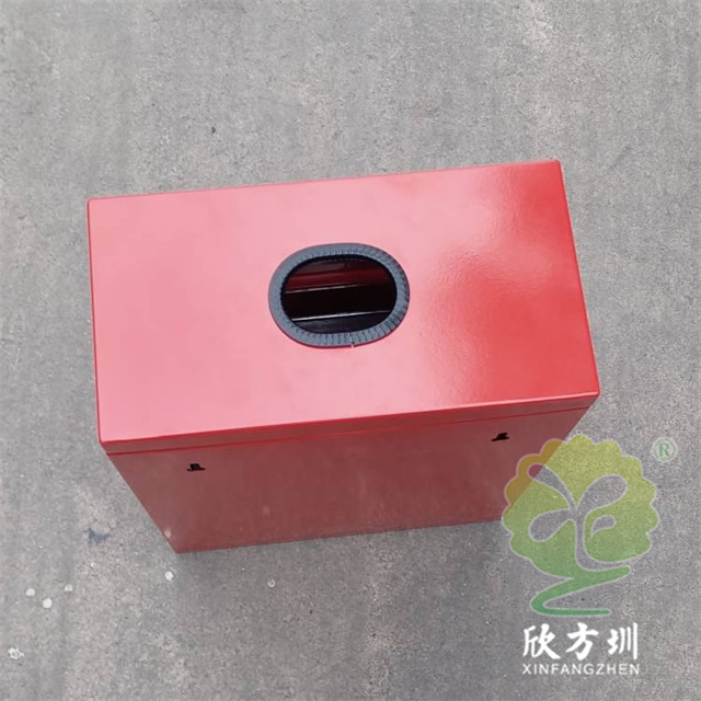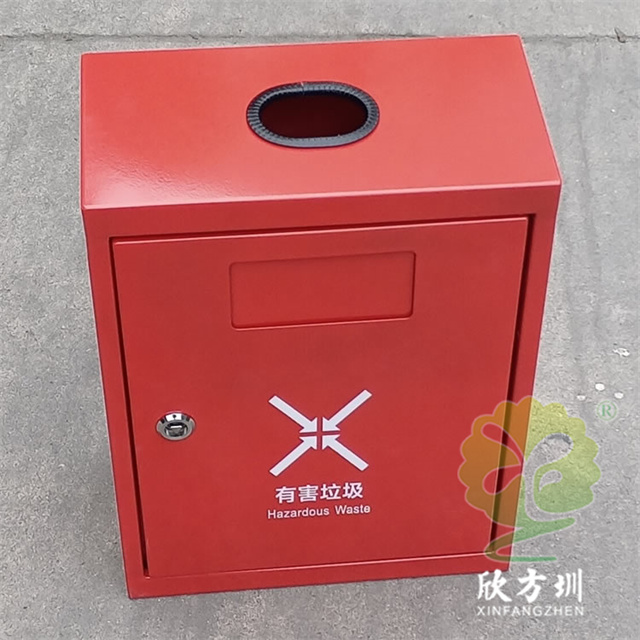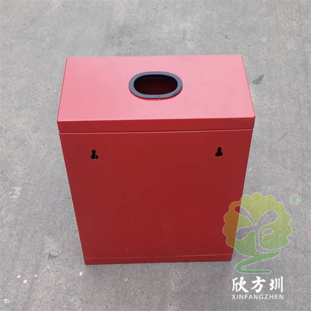掛壁式噴粉烤漆方形不銹鋼有害垃圾箱采用0.8mm厚201不銹鋼板制造,也可以采用鍍鋅鐵板制作,方形掛壁式橢圓形直投口設(shè)計(jì),金屬表面噴粉烤漆紅色上色,正面采用三角鑰匙可以取出內(nèi)置的鍍鋅板內(nèi)筒,投口帶膠墊防止投放時(shí)刮傷手掌。